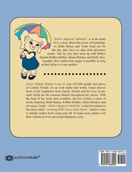 "Bella's Magical Umbrella" is at the heart of it, a story about the power of friendship. As the main characters, Bella Bunny and Trudy embark on their first adventure together and quickly learn that the true magic that happens comes from the realization that their friends are true. As the first release in the "Growing With Grace" Series, readers are also introduced to the adorable characters Robbie Bobbie, Mona Monkey and Karla Q. Each one lending their own unique voice to the storyline.