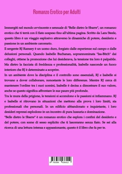 Immergiti nel mondo avvincente e sensuale di "Belle dietro le Sbarre", un romanzo erotico che ti terrà con il fiato sospeso fino all'ultima pagina. Scritto da Lara Steele, questo libro è un viaggio esplosivo attraverso le dinamiche di potere, desiderio e passione in un ambiente carcerario.Il sergente RJ Ramsey è un uomo duro, forgiato dalle esperienze sul campo e dalle delusioni personali. Quando Isabelle Buchanan, soprannominata "Isa-Bitch" dai colleghi, ottiene la promozione che lui desiderava, la tensione tra loro è palpabile. Ma dietro la facciata di freddezza e professionalità, Isabelle nasconde un fuoco interiore che RJ è determinato a scoprire.In un ambiente dove la disciplina e il controllo sono essenziali, RJ e Isabelle si trovano a dover collaborare, nonostante le loro differenze. Mentre RJ cerca di mantenere l'ordine tra i suoi uomini, Isabelle è decisa a dimostrare il suo valore, anche se questo significa affrontare le sue paure più profonde.Tra le mura della prigione, le tensioni si accendono e le passioni si infiammano. RJ e Isabelle si ritrovano in situazioni che mettono alla prova i loro limiti, sia professionali che personali. In un edificio abbandonato e inquietante, i loro desideri repressi esplodono in un incontro di pura lussuria e dominazione."Belle dietro le Sbarre" è un romanzo erotico che esplora i confini del desiderio e del potere, con scene di sesso esplicito che ti lasceranno senza fiato. Se sei alla ricerca di una lettura intensa e appassionante, questo è il libro che fa per te.