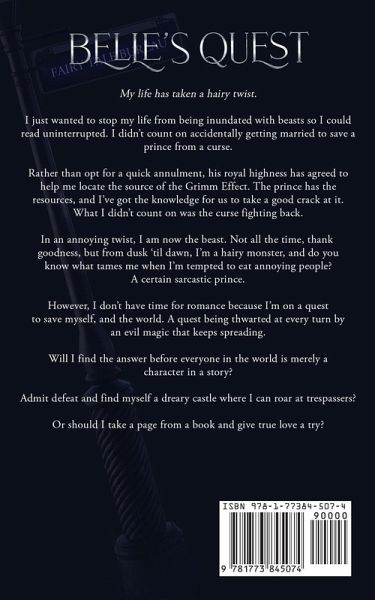 My life has taken a hairy twist. I've studied the Grimm Effect and am prepared to be the one who finally breaks it. The others who came before me failed, but I have an advantage they didn't. I escaped my unhappily-ever-after. The one thing I don't have? Jet-setting money. Good thing a prince I saved while working at the Fairytale Bureau has deep pockets. He's offered to help me end the jinxing once and for all. What I didn't count on was the curse fighting back. In an annoying twist, I am now the beast. From dusk 'til dawn, I'm a hairy monster, and do you know what tames me when I'm tempted to eat annoying people? A certain sarcastic prince. However, I don't have time for romance because I'm on a quest to save myself, and the world. A quest being thwarted at every turn by the evil magic that keeps spreading. Will I find the answer before everyone in the world is merely a character in a story? Admit defeat and take up residence in a dreary castle where I can roar at trespassers? Or should I take a page from a book and give true love a try?