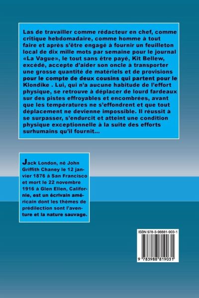 Las de travailler comme rédacteur en chef, comme critique hebdomadaire, comme homme à tout faire et après s'être engagé à fournir un feuilleton local de dix mille mots par semaine pour le journal La Vague, le tout sans être payé, Kit Bellew, excédé, accepte d'aider son oncle à transporter une grosse quantité de matériels et de provisions pour le compte de deux cousins qui partent pour le Klondike . Lui, qui n'a aucune habitude de l'effort physique, se retrouve à déplacer de lourd fardeaux sur des pistes effroyables et encombrées, avant que les températures ne s'effondrent et que tout…mehr