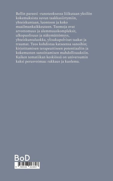 Bellin pareesi -runoteoksessa liiikutaan yksilön kokemuksista suvun taakkasiirtymiin, yhteiskuntaan, luontoon ja koko maailmankaikkeuteen. Teemoja ovat arvottomuus ja alemmuuskompleksit, ulkopuolisuus ja näkymättömyys, yhteiskuntaluokka, ylisukupolviset taakat ja traumat. Teos kohdistaa katseensa sanoihin; kirjoittamisen terapeuttiseen potentiaaliin ja kokemusten sanoittamisen mahdollisuuksiin. Kaiken tematiikan keskiössä on universumin kaksi perusvoimaa: rakkaus ja kuolema.