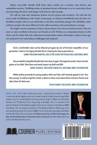 Master storyteller Rosalie Hall Hunt takes readers on a journey into history and unfamiliar territory. Thrilling stories of missions heroes will amaze us as we read about them encountering adventure and danger with bravery and courage. We will see Ann and Adoniram Judson survive prison and treachery. We will ride the dusty trails of Oklahoma with Annie Armstrong; we will peer breathlessly into the door of a Buddhist temple with six-year-old Esther as she flees immediate danger. We will follow other ordinary people who have followed God's call to missions with extraordinary courage. We might even be surprised at what we learn about a few of our missions heroes. The new ones we meet are likely to become our friends as well. Written as a companion book to Lottie Moon and the Silent Bell, this collection of stand-alone stories will inspire readers of any age. Get prepared to be entertained, challenged and inspired.