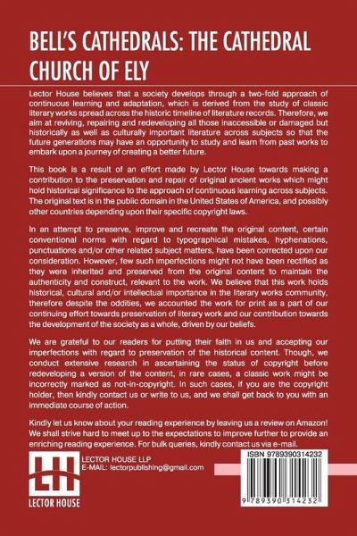 Bell's Cathedrals: The Cathedral Church Of Ely: A History And Description Of The Building With A Short Account Of The Former Monastery And Of The See This book is a result of an effort made by us towards making a contribution to the preservation and repair of original classic literature. In an attempt to preserve, improve and recreate the original content, we have worked towards: 1. Type-setting & Reformatting: The complete work has been re-designed via professional layout, formatting and type-setting tools to re-create the same edition with rich typography, graphics, high quality images, and table elements, giving our readers the feel of holding a 'fresh and newly' reprinted and/or revised edition, as opposed to other scanned & printed (Optical Character Recognition - OCR) reproductions. 2. Correction of imperfections: As the work was re-created from the scratch, therefore, it was vetted to rectify certain conventional norms with regard to typographical mistakes, hyphenations, punctuations, blurred images, missing content/pages, and/or other related subject matters, upon our consideration. Every attempt was made to rectify the imperfections related to omitted constructs in the original edition via other references. However, a few of such imperfections which could not be rectified due to intentional\unintentional omission of content in the original edition, were inherited and preserved from the original work to maintain the authenticity and construct, relevant to the work. We believe that this work holds historical, cultural and/or intellectual importance in the literary works community, therefore despite the oddities, we accounted the work for print as a part of our continuing effort towards preservation of literary work and our contribution towards the development of the society as a whole, driven by our beliefs. We are grateful to our readers for putting their faith in us and accepting our imperfections with regard to preservation of the historical content. HAPPY READING!