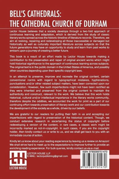 Bell's Cathedrals: The Cathedral Church Of Durham: A Description Of Its Fabric And A Brief History Of The Episcopal See This book is a result of an effort made by us towards making a contribution to the preservation and repair of original classic literature. In an attempt to preserve, improve and recreate the original content, we have worked towards: 1. Type-setting & Reformatting: The complete work has been re-designed via professional layout, formatting and type-setting tools to re-create the same edition with rich typography, graphics, high quality images, and table elements, giving our readers the feel of holding a 'fresh and newly' reprinted and/or revised edition, as opposed to other scanned & printed (Optical Character Recognition - OCR) reproductions. 2. Correction of imperfections: As the work was re-created from the scratch, therefore, it was vetted to rectify certain conventional norms with regard to typographical mistakes, hyphenations, punctuations, blurred images, missing content/pages, and/or other related subject matters, upon our consideration. Every attempt was made to rectify the imperfections related to omitted constructs in the original edition via other references. However, a few of such imperfections which could not be rectified due to intentional\unintentional omission of content in the original edition, were inherited and preserved from the original work to maintain the authenticity and construct, relevant to the work. We believe that this work holds historical, cultural and/or intellectual importance in the literary works community, therefore despite the oddities, we accounted the work for print as a part of our continuing effort towards preservation of literary work and our contribution towards the development of the society as a whole, driven by our beliefs. We are grateful to our readers for putting their faith in us and accepting our imperfections with regard to preservation of the historical content. HAPPY READING!