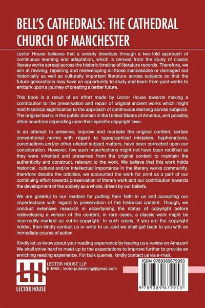 Bell's Cathedrals: The Cathedral Church Of Manchester: A Short History And Description Of The Church And Of The Collegiate Buildings Now Known As Chetham's Hospital This book is a result of an effort made by us towards making a contribution to the preservation and repair of original classic literature. In an attempt to preserve, improve and recreate the original content, we have worked towards: 1. Type-setting & Reformatting: The complete work has been re-designed via professional layout, formatting and type-setting tools to re-create the same edition with rich typography, graphics, high quality images, and table elements, giving our readers the feel of holding a 'fresh and newly' reprinted and/or revised edition, as opposed to other scanned & printed (Optical Character Recognition - OCR) reproductions. 2. Correction of imperfections: As the work was re-created from the scratch, therefore, it was vetted to rectify certain conventional norms with regard to typographical mistakes, hyphenations, punctuations, blurred images, missing content/pages, and/or other related subject matters, upon our consideration. Every attempt was made to rectify the imperfections related to omitted constructs in the original edition via other references. However, a few of such imperfections which could not be rectified due to intentional\unintentional omission of content in the original edition, were inherited and preserved from the original work to maintain the authenticity and construct, relevant to the work. We believe that this work holds historical, cultural and/or intellectual importance in the literary works community, therefore despite the oddities, we accounted the work for print as a part of our continuing effort towards preservation of literary work and our contribution towards the development of the society as a whole, driven by our beliefs. We are grateful to our readers for putting their faith in us and accepting our imperfections with regard to preservation of the historical content. HAPPY READING!