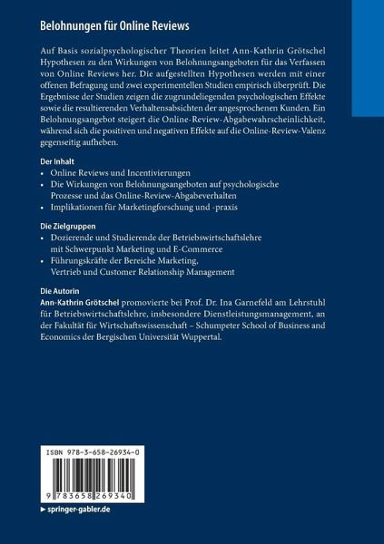 Auf Basis sozialpsychologischer Theorien leitet Ann-Kathrin Grötschel Hypothesen zu den Wirkungen von Belohnungsangeboten für das Verfassen von Online Reviews her. Die aufgestellten Hypothesen werden mit einer offenen Befragung und zwei experimentellen Studien empirisch überprüft. Die Ergebnisse der Studien zeigen die zugrundeliegenden psychologischen Effekte sowie die resultierenden Verhaltensabsichten der angesprochenen Kunden. Ein Belohnungsangebot steigert die Online-Review-Abgabewahrscheinlichkeit, während sich die positiven und negativen Effekte auf die Online-Review-Valenz gegenseitig aufheben.