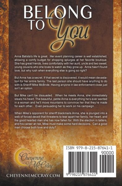 Anna Batista's life is great. Her event planning career is well established, allowing a comfy budget for shopping splurges at her favorite boutique. She has great friends, lives comfortably with her aunt, uncle, and two young cousins. Anna hasn't found love, but why rush when everything else is going so right? However, Anna has a secret. If that secret is discovered, it would mean devastation for her entire family. The last person she should have anything to do with is Sheriff Mike McBride. Having anyone in law enforcement close just isn't an option. But Mike can't be dissuaded. When he meets Anna, she immediately steals his heart. Anna is everything he's ever wanted in a woman and he'll move mountains to convince her that they're made for each other. When Mike's opponent for sheriff blackmails Anna, she is plunged into a web of forced deceit that threatens to tear apart her family, her heart, and the good-hearted man she has fallen for. With the election in tatters, and his career at risk, Mike must make some hard decisions. Can a good man choose between love and duty?