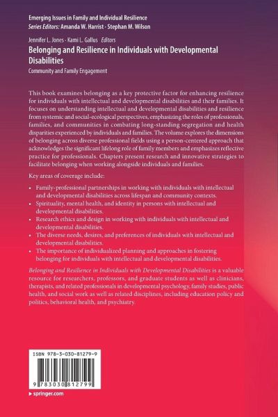 Family-professional partnerships in working with individuals with intellectual and developmental disabilities across lifespan and community contexts. Spirituality, mental health, and identity in persons with intellectual and developmental disabilities. Research ethics and design in working with individuals with intellectual and developmental disabilities. The diverse needs, desires, and preferences of individuals with intellectual and developmental disabilities. The importance of individualized planning and approaches in fostering belonging for individuals with intellectual and developmental disabilities. Belonging and Resilience in Individuals with Developmental Disabilities is a valuable resource for researchers, professors, and graduate students as well as clinicians, therapists, and related professionals in developmental psychology, family studies, public health, and social work as well as related disciplines, including education policy andpolitics, behavioral health, and psychiatry.