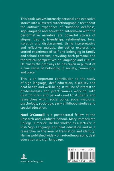 This book weaves intensely personal and evocative stories into a layered autoethnographic text about the author's experience of childhood deafness, sign language and education. Interwoven with the performative narrative are powerful stories of stigma, trauma, friendships, relationships, love, isolation and displacement. Using interpretative and reflective analysis, the author explores the storied experience of self and belonging in family and school contexts, providing both personal and theoretical perspectives on language and culture. He traces the pathways he has taken in pursuit of a true sense of belonging in society, community and place.