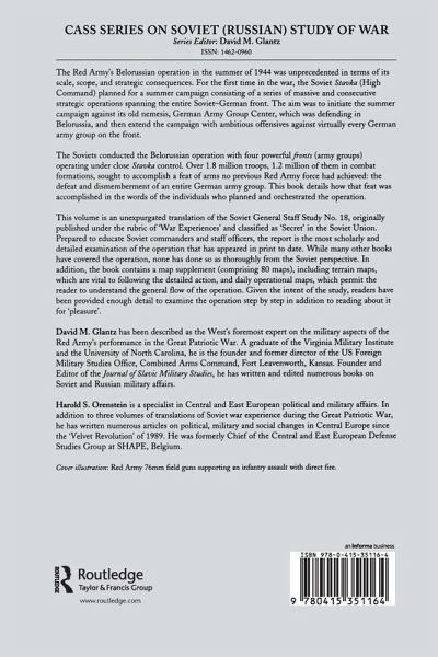 A new edited translation of the Soviet Staff study of the Red Army's Belorussian operation in the summer of 1944, which was unprecedented in terms of its scale, scope and strategic consequences. The Soviet Stavka had planned a campaign consisting of a series of massive operations spanning the entire Soviet-German front. Four powerful fronts (army groups) operated under close Stavka (high command) control. Over 1.8 million troops acomplished a feat unique in the history of the Red Army: the defeat and dismemberment of an entire German army group. This book is a translation of the Soviet General Staff Study No 18, a work originally classified as 'secret' and intended to educate Soviet commanders and staff officers. The operation is presented from the Soviet perspective, in the words of the individuals who planned and orchestrated the plans. A map supplement, including terrain maps, is provided to illustrate the flow of the operation in greater detail.