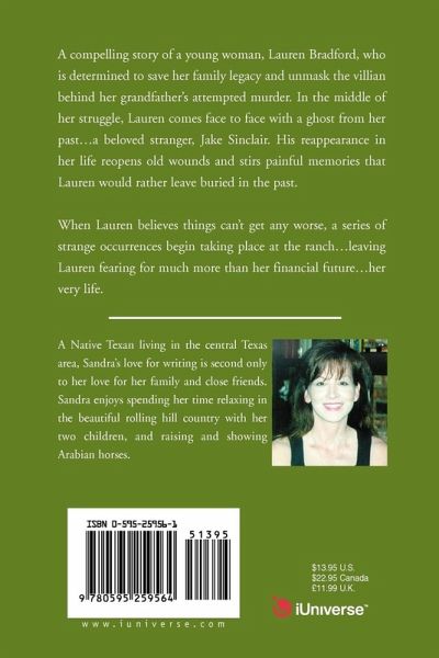 A heart-warming story of a young woman, Lauren Bradford, who is determined to save her family legacy from bank foreclosure and unmask the villian behind her grandfather's attempted murder. In the middle of her battle, Lauren comes face to face with a ghost from her past...a beloved stranger, Jake Sinclair. His reappearance in her life reopens old wounds and stirs painful memories that Lauren would rather have remain buried in the past.