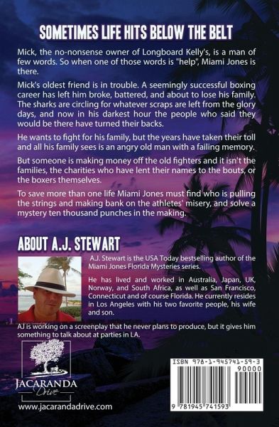 Sometimes Life Hits Below The Belt Mick, the no-nonsense owner of Longboard Kelly's, is a man of few words. So when one of those words is "help", Miami Jones is there. Mick's oldest friend is in trouble. A seemingly successful boxing career has left him broke, battered, and about to lose his family. The sharks are circling for whatever scraps are left from the glory days, and now in his darkest hour the people who said they would be there have turned their backs. He wants to fight for his family, but the years have taken their toll and all his family sees is an angry old man with a failing memory. But someone is making money off the old fighters and it isn't the families, the trainers, or the boxers themselves. To save more than one life Miami Jones must find who is pulling the strings and making bank on the athletes' misery, and solve a mystery ten thousand punches in the making.
