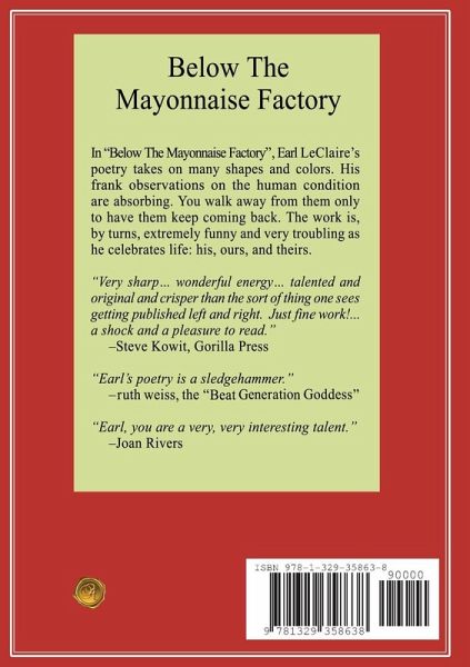 In "Below The Mayonnaise Factory", Earl LeClaire's poetry takes on many shapes and colors. His frank observations on the human condition are absorbing. You walk away from them only to have them keep coming back. The work is, by turns, extremely funny and very troubling as he celebrates life: his, ours, and theirs. "Very sharp... wonderful energy... talented and original and crisper than the sort of thing one sees getting published left and right. Just fine work!... a shock and a pleasure to read." -Steve Kowit, Gorilla Press. "Earl's poetry is a sledgehammer." -ruth weiss, the "Beat Generation Goddess".