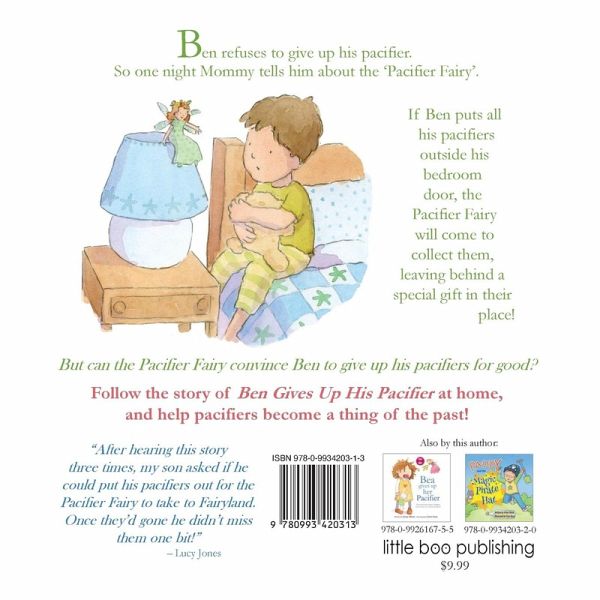 A picture book designed to help children who are struggling to give up their pacifiers. Children love it because it's a fabulous fairy story with beautiful illustrations, and parents love it because it enables children to kick their pacifier habit once and for all. This book ALSO tackles the days following the departure of the pacifiers, so parents don't have to worry about a child missing their pacifiers once they've gone. The book follows the story of a little boy called Ben, who refuses to give up his pacifier. Then one night his mother persuades him to leave all his pacifiers outside his room for the 'Pacifier Fairy' to take, (in exchange for a special gift). Ben gets to meet the fairy, who shows him that it IS possible to give up pacifiers without shedding a single tear. The book teaches children why it makes sense to give up pacifiers, and offers up some fun ideas to stop them missing them once they've gone. After reading, parents can follow the book at home, and arrange an exciting visit from the Pacifier Fairy, to the delight of their child. Ben Gives Up His Pacifier provides an easy, fun way for parents to say goodbye to pacifiers for good. Also see: Bea Gives Up Her Pacifier