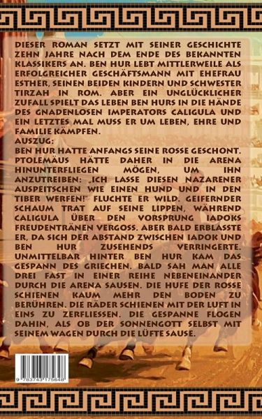 Dieser Roman setzt mit seiner Geschichte zehn Jahre nach dem Ende des bekannten Klassikers an. Ben Hur lebt mittlerweile als erfolgreicher Geschäftsmann mit Ehefrau Esther, seinen beiden Kindern und Schwester Tirzah in Rom. Aber ein unglücklicher Zufall spielt das Leben Ben Hurs in die Hände des gnadenlosen Imperators Caligula und ein letztes Mal muss er um Leben, Ehre und Familie kämpfen. Auszug:Ben Hur hatte anfangs seine Rosse geschont. Ptolemäus hätte daher in die Arena hinunterfliegen mögen, um ihn anzutreiben: "Ich lasse diesen Nazarener auspeitschen wie einen Hund und in den Tiber werfen!" fluchte er wild. Geifernder Schaum trat auf seine Lippen, während Caligula über den Vorsprung Iadoks Freudentränen vergoss. Aber bald erblasste er, da sich der Abstand zwischen Iadok und Ben Hur zusehends verringerte. Unmittelbar hinter Ben Hur kam das Gespann des Griechen. Bald sah man alle drei fast in einer Reihe nebeneinander durch die Arena sausen. Die Hufe der Rosse schienen kaum mehr den Boden zu berühren. Die Räder schienen mit der Luft in eins zu zerfließen. Die Gespanne flogen dahin, als ob der Sonnengott selbst mit seinem Wagen durch die Lüfte sause.