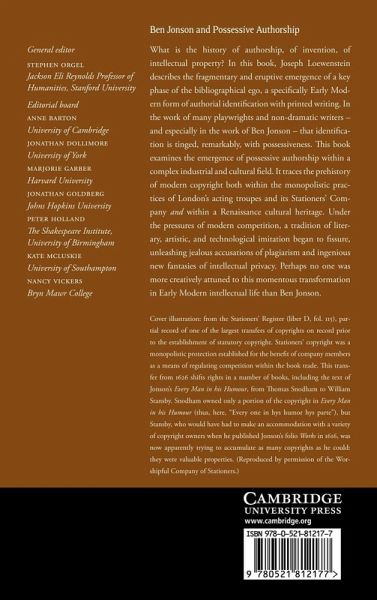 What is the history of authorship, of invention, of intellectual property? Joseph Loewenstein describes the fragmentary and eruptive emergence of a key phase of the bibliographical ego, a specifically Early Modern form of authorial identification with printed writing. In the work of many playwrights and non-dramatic writers - and especially that of Ben Jonson - that identification is tinged, remarkably, with possessiveness. This 2002 book examines the emergence of possessive authorship within a complex industrial and cultural field. It traces the prehistory of modern copyright both within the monopolistic practices of London's acting troupes and its Stationers' Company and within a Renaissance cultural heritage. Under the pressures of modern competition, a tradition of literary, artistic and technological imitation began to fissure, unleashing jealous accusations of plagiarism and ingenious new fantasies of intellectual privacy. Perhaps no-one was more creatively attuned to this momentous transformation in Early Modern intellectual life than Ben Jonson.