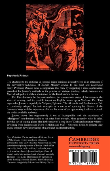 The challenge to the audience in Jonson's major comedies is usually seen as an extension of the provocative techniques of English Morality drama. In this lucid and penetrating study, Professor Duncan aims to supplement that view by suggesting a more sophisticated precedent for Jonson's methods in the practice of 'oblique teaching', which Erasmus and More developed out of their admiration for the Greek author Lucian. Jonson shows that stage-comedy is not as incompatible with the techniques of 'Menippean' non-dramatic satire as has often been thought. More generally, what is called here his 'art of teasing' places him in the centre of a long line of Christian humanist writers - stretching from Erasmus and More to Milton and Swift - who used fiction to educate their public through devious processes of moral and intellectual testing.