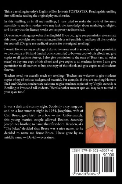 This is a retelling in today's English of Ben Jonson's POETASTER. Reading this retelling first will make reading the original play much easier. Do you know a language other than English? If you do, I give you permission to translate this book, copyright your translation, publish or self-publish it, and keep all the royalties for yourself. (Do give me credit, of course, for the original retelling.) I would like to see my retellings of classic literature used in schools, so I give permission to the country of Finland (and all other countries) to buy one copy of this eBook and give copies to all students forever. I also give permission to the state of Texas (and all other states) to buy one copy of this eBook and give copies to all students forever. I also give permission to all teachers to buy one copy of this eBook and give copies to all students forever. Teachers need not actually teach my retellings. Teachers are welcome to give students copies of my eBooks as background material. For example, if they are teaching Homer's Iliad and Odyssey, teachers are welcome to give students copies of my Virgil's Aeneid: A Retelling in Prose and tell students, "Here's another ancient epic you may want to read in your spare time."