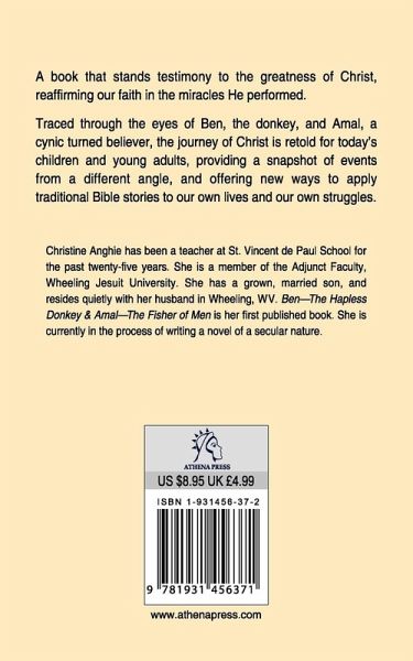 A book that stands testimony to the greatness of Christ, reaffirming our faith in the miracles He performed. Traced through the eyes of Ben, the donkey, and Amal, a cynic turned believer, the journey of Christ is retold for today's children and young adults, providing a snapshot of events from a different angle, and offering new ways to apply traditional Bible stories to our own lives and our own struggles. Christine Anghie has been a teacher at St. Vincent de Paul School for the past twenty-five years. She is a member of the Adjunct Faculty, Wheeling Jesuit University. She has a grown, married son, and resides quietly with her husband in Wheeling, WV. Ben-The Hapless Donkey & Amal-The Fisher of Men is her first published book. She is currently in the process of writing a novel of a secular nature.