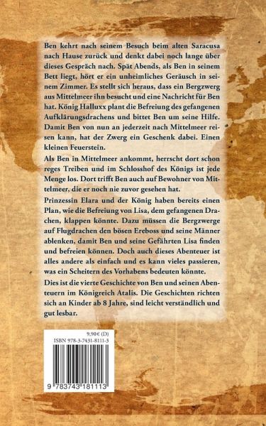 Ben kehrt nach seinem Besuch beim alten Saracusa nachhause zurück und denkt dabei nach lange über dieses Gespräch nach. Spät abends, als Ben in seinem Bett liegt, hört er ein unheimliches Geräusch in seinem Zimmer. Es stellt sich heraus, dass ein Bergzwerg aus Mittelmeer ihn besucht und eine Nachricht für Ben hat. König Halluxx plant die Befreiung des gefangenen Aufklärungsdrachens und bittet Ben um seine Hilfe. Damit Ben von nun an jederzeit noch Mittelmeer reisen kann, hat der Zwerg ein Geschenk dabei. Einen kleinen Feuerstein. Als Ben in Mittelmeer ankommt, herrscht dort schon reges Treiben und im Schlosshof des Königs ist jede Menge los. Dort trifft Ben auch auf Bewohner von Mittelmeer, die er noch nie zuvor gesehen hat.Prinzessin Elara und der König haben bereits einen Plan, wie die Befreiung von Lisa, dem gefangenen Drachen, klappen könnte. Dazu müssen die Bergzwerge auf Flugdrachen den bösen Ereboss und seine Männer ablenken, damit Ben und seine Gefährten Lisa finden und befreien können. Doch auch dieses Abenteuer ist alles andere als einfach und es kann vieles passieren, was ein Scheitern des Vorhabens bedeuten könnte.