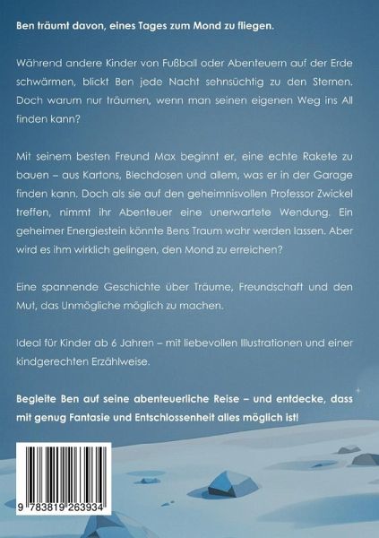 Ben träumt davon, eines Tages zum Mond zu fliegen. Während andere Kinder von Fußball oder Abenteuern auf der Erde schwärmen, blickt Ben jede Nacht sehnsüchtig zu den Sternen. Doch warum nur träumen, wenn man seinen eigenen Weg ins All finden kann? Mit seinem besten Freund Max beginnt er, eine echte Rakete zu bauen - aus Kartons, Blechdosen und allem, was er in der Garage finden kann. Doch als sie auf den geheimnisvollen Professor Zwickel treffen, nimmt ihr Abenteuer eine unerwartete Wendung. Ein geheimer Energiestein könnte Bens Traum wahr werden lassen. Aber wird es ihm wirklich gelingen, den Mond zu erreichen? Eine spannende Geschichte über Träume, Freundschaft und den Mut, das Unmögliche möglich zu machen. Ideal für Kinder ab 6 Jahren - mit liebevollen Illustrationen und einer kindgerechten Erzählweise. Begleite Ben auf seine abenteuerliche Reise - und entdecke, dass mit genug Fantasie und Entschlossenheit alles möglich ist!