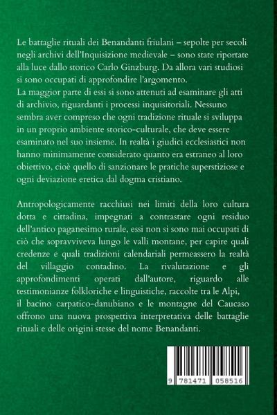 Le battaglie rituali dei Benandanti friulani - sepolte per secoli negli archivi dell'Inquisizione medioevale - sono state riportate alla luce dallo storico Carlo Ginzburg. Da allora, vari studiosi si sono occupati di approfondire l'argomento. La maggior parte di essi si sono attenuti ad esaminare gli atti di archivio, riguardanti i processi inquisitoriali. Nessuno sembra aver compreso che ogni tradizione rituale si sviluppa in un proprio ambiente storico-culturale, che deve essere esaminato nel suo insieme. In realtà, i giudici ecclesiastici non hanno minimamente considerato quanto era estraneo al loro obiettivo, cioè quello di sanzionare le pratiche superstiziose e ogni deviazione eretica dal dogma cristiano. Antropologicamente racchiusi nei limiti della loro cultura dotta e cittadina, impegnati a contrastare ogni residuo dell'antico paganesimo rurale, essi non si sono mai occupati di ciò che sopravviveva lungo le valli montane, per capire quali credenze e quali tradizioni calendariali permeassero la realtà del villaggio contadino. La rivalutazione e gli approfondimenti operati dall'autore, riguardo alle testimonianze folkloriche e linguistiche, raccolte tra le Alpi, il bacino carpatico-danubiano e le montagne del Caucaso, offrono una nuova prospettiva interpretativa delle battaglie rituali e delle origini stesse del nome Benandanti.