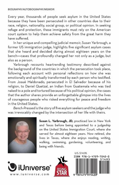Every year, thousands of people seek asylum in the United States because they have been persecuted in other countries due to their race, religion, nationality, social group, or political opinion. In seeking refuge and protection, these immigrants must rely on the American court system to help them achieve safety from the great harm they have suffered. In her unique and compelling judicial memoir, Susan Yarbrough, a former US immigration judge, highlights five significant asylum cases that she heard and decided during almost eighteen years on the benchcases that profoundly changed her not only as a judge, but also as a person. Yarbrough recounts heartrending testimony described against the background of the countries in which the persecution took place, following each account with personal reflections on how she was emotionally and spiritually transformed by each person who testified. From Josué Maldonado, persecuted in El Salvador because of his religion, to Daniel Quetzal, an Indian from Guatemala who was tied naked to a pole and tortured because of his political opinion, the cases that the author shares provide an unforgettable glimpse into the lives of courageous people who risked everything for peace and freedom in the United States. Bench-Pressed is the story of five asylum seekers and the judge who was irrevocably changed by the intersection of her life with theirs.