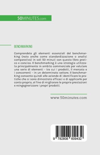 Comprendete gli elementi essenziali del benchmarking (noto anche come standardizzazione o analisi comparativa) in soli 50 minuti con questo libro pratico e conciso. Il benchmarking è una strategia utilizzata principalmente in ambito commerciale per valutare una serie di elementi - tra cui i prodotti, il mercato e i concorrenti - in un determinato settore. Il benchmarking consente quindi alle aziende di identificare le pratiche che si sono dimostrate efficaci e di applicarle per conto proprio, al fine di migliorare le proprie prestazioni e reingegnerizzare i propri prodotti. Questo libro fornisce una pratica introduzione su come utilizzare il benchmarking per scoprire le migliori pratiche delle aziende leader e adattarle per migliorare la propria attività. Include anche casi di studio reali, una discussione sulle carenze dello strumento, compresi i suoi potenziali costi, e un'introduzione ai modelli correlati, come il Total Quality Management e il PDCA.