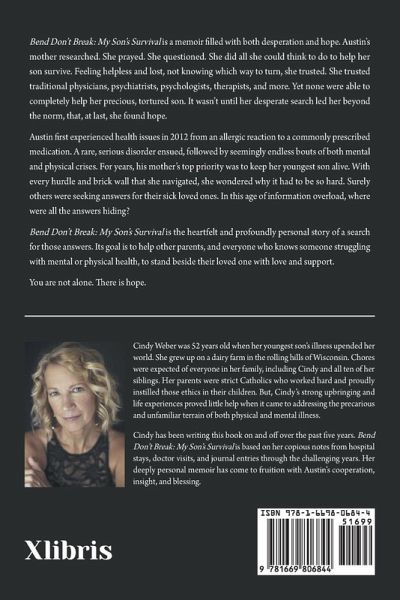 Bend Don't Break: My Son's Survival is a memoir filled with both desperation and hope. Austin's mother researched. She prayed. She questioned. She did all she could think to do to help her son survive. Feeling helpless and lost, not knowing which way to turn, she trusted. She trusted traditional physicians, psychiatrists, psychologists, therapists, and more. Yet none were able to completely help her precious, tortured son. It wasn't until her desperate search led her beyond the norm, that, at last, she found hope. Austin first experienced health issues in 2012 from an allergic reaction to a commonly prescribed medication. A rare, serious disorder ensued, followed by seemingly endless bouts of both mental and physical crises. For years, his mother's top priority was to keep her youngest son alive. With every hurdle and brick wall that she navigated, she wondered why it had to be so hard. Surely others were seeking answers for their sick loved ones. In this age of information overload, where were all the answers hiding? Bend Don't Break: My Son's Survival is the heartfelt and profoundly personal story of a search for those answers. Its goal is to help other parents, and everyone who knows someone struggling with mental or physical health, to stand beside their loved one with love and support. You are not alone. There is hope.