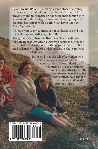 Bend Like the Willow is a many layered story of a young naive American girl who sets out for her first year of university and finds instead a shocking introduction into a cross-cultural marriage of contradiction, mystery and eventual heartbreak with a darkly handsome Moslem Arab-Algerian man. "If I take you to my country, you must learn to bend like the willow or you will snap," he tells her. Along the path to bending like the willow she discovers that life in post-war Algeria with two babies is as fraught with danger and sadness as is the man she married. Both are burdened with hopes and expectations that can never be fulfilled. In the end, it is the tale of a woman who loves a man and a man who loves his country. He is so committed to honouring his love of country and tradition that he fulfills the promise he made to his wife’s father, even though it both saves and breaks apart four lives.