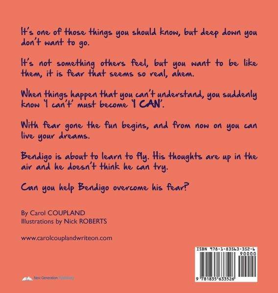 It's one of those things you should know, but deep down you don't want to go. It's not something others feel, but you want to be like them, it is fear that seems so real, ahem. When things happen that you can't understand, you suddenly know 'I can't' must become 'I CANI CAN'. With fear gone the fun begins, and from now on you can live your dreams. Bendigo is about to learn to fly. His thoughts are up in the air and he doesn't think he can try. Can you help Bendigo overcome his fear?