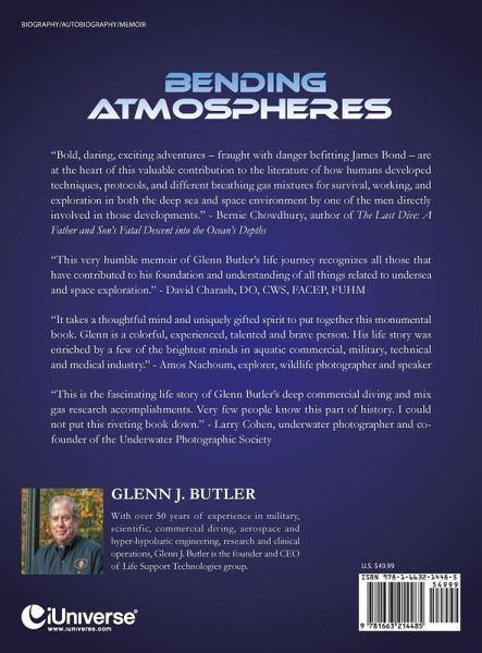 A memoir of a young man's dream of space flight and deep diving, Bending Atmospheres is a dazzling adventure recounting daring, heroic professionals learning to work at undersea pressures to 1,000 feet sea water and in the vacuum of orbital space traveling at 18,000 miles an hour. Readers are taken through the early development of deep diving tri-mix, nitrox and neon diving gas mixtures and decompression tables, to early diving in the treacherous North Sea, National Geographic expeditions seeking famed sunken treasure, and methods used to train astronauts for space walks to repair the Hubble Space Telescope. "Bold, daring, exciting adventures - fraught with danger befitting James Bond - are at the heart of this valuable contribution to the literature of how humans developed techniques, protocols, and different breathing gas mixtures for survival, working, and exploration in both the deep sea and space environment by one of the men directly involved in those developments." - Bernie Chowdhury - Author - The Last Dive For more information visit: www.bendingatmospheres.com.