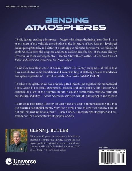 A memoir of a young man's dream of space flight and deep diving, Bending Atmospheres is a dazzling adventure recounting daring, heroic professionals learning to work at undersea pressures to 1,000 feet sea water and in the vacuum of orbital space traveling at 18,000 miles an hour. Readers are taken through the early development of deep diving tri-mix, nitrox and neon diving gas mixtures and decompression tables, to early diving in the treacherous North Sea, National Geographic expeditions seeking famed sunken treasure, and methods used to train astronauts for space walks to repair the Hubble Space Telescope. "Bold, daring, exciting adventures - fraught with danger befitting James Bond - are at the heart of this valuable contribution to the literature of how humans developed techniques, protocols, and different breathing gas mixtures for survival, working, and exploration in both the deep sea and space environment by one of the men directly involved in those developments." - Bernie Chowdhury - Author - The Last Dive For more information visit: www.bendingatmospheres.com.