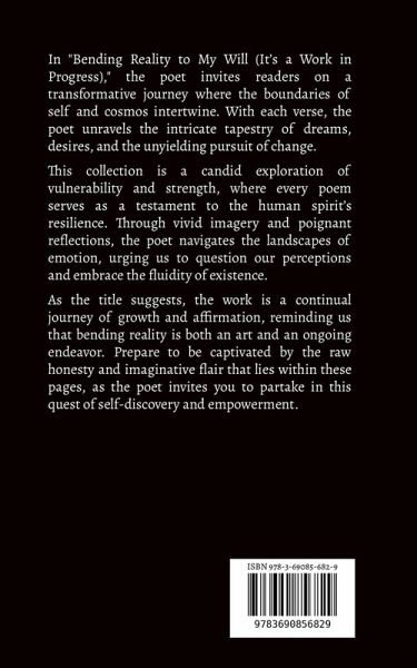 In "Bending Reality to My Will (It's a Work in Progress)," the poet invites readers on a transformative journey where the boundaries of self and cosmos intertwine. With each verse, the poet unravels the intricate tapestry of dreams, desires, and the unyielding pursuit of change. This collection is a candid exploration of vulnerability and strength, where every poem serves as a testament to the human spirit's resilience. Through vivid imagery and poignant reflections, the poet navigates the landscapes of emotion, urging us to question our perceptions and embrace the fluidity of existence. As the title suggests, the work is a continual journey of growth and affirmation, reminding us that bending reality is both an art and an ongoing endeavor. Prepare to be captivated by the raw honesty and imaginative flair that lies within these pages, as the poet invites you to partake in this quest of self-discovery and empowerment.