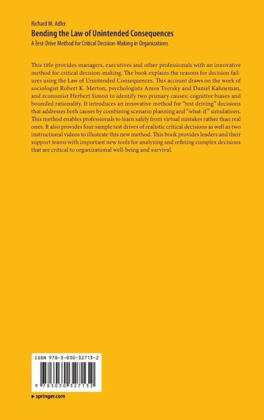This title provides managers, executives and other professionals with an innovative method for critical decision-making. The book explains the reasons for decision failures using the Law of Unintended Consequences. This account draws on the work of sociologist Robert K. Merton, psychologists Amos Tversky and Daniel Kahneman, and economist Herbert Simon to identify two primary causes : cognitive biases and bounded rationality. It introduces an innovative method for "test driving" decisions that addresses both causes by combining scenario planning and "what-if" simulations. This method enables professionals to learn safely from virtual mistakes rather than real ones. It also provides four sample test drives of realistic critical decisions as well as two instructional videos to illustrate this new method. This book provides leaders and their support teams with important new tools for analyzing and refining complex decisions that are critical to organizational well-being and survival.