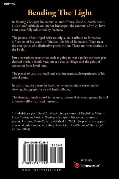 In Bending The Light, his second volume of verse, René A. Martin trains his lens unflinchingly on interior landscapes, the contours of which have been powerfully influenced by memory. The poems, often tinged with nostalgia, are a tribute to formative influences of his youth in Trinidad, his island homeland. They trace the emergence of a distinctive poetic vision. There are three sections to the book. Part one explores experiences such as going to hear a police orchestra play classical music, a family vacation at a coastal village, and the pains of separation from loved ones. The poems of part two recall and examine memorable experiences of his school years. In part three, the poems lay bare the myriad emotions stirred up by viewing photographs in an old family album. The themes, though rooted in memory, transcend time and geography and ultimately affirm a shared humanity.