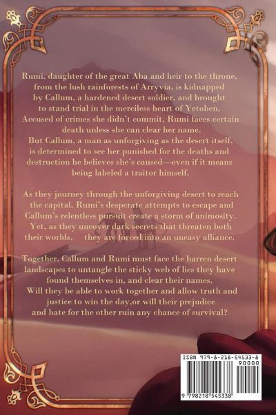 Beneath a Desert Moon, a romantic fantasy set in a vast desert world where justice is harsh, their love is forbidden, and the line between enemies and allies blurs in the sands of fate. Rumi, daughter of the great Aba and heir to the throne, from the lush rainforests of Arryvia, is kidnapped by Callum, a hardened desert soldier, and brought to stand trial in the merciless heart of Yetoben. Accused of crimes she didn't commit, Rumi faces certain death unless she can clear her name. But Callum, a man as unforgiving as the desert itself, is determined to see her punished for the deaths and destruction he believes she's caused-even if it means being labeled a traitor himself. As they journey through the unforgiving desert to reach the capitol, Rumi's desperate attempts to escape and Callum's relentless pursuit create a storm of animosity. Yet, as they uncover dark secrets that threaten both their worlds, they are forced into an uneasy alliance. With each revelation, Rumi's hatred for Callum begins to shift, complicated by a growing attraction that neither can ignore. As the truth about the real enemy behind the unrest emerges, they must decide whether to trust each other-or be destroyed by the past that binds them. Enemies to lovers meets fantasy adventure in this tale of betrayal, redemption, and love forged in the heart of a dangerous desert. For readers who enjoyed books like When the Moon Hatched, Divine Rivals, Songbird of the Sorrows, or who's childhood was impacted by movies like The Mummy, Atlantis, and the Mask of Zorro.