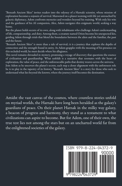"Beneath Ancient Skies" invites readers into the odyssey of a Harnaki scientist, whose mission of exploration becomes a sojourn of survival. Marooned on a planet teeming with life yet untouched by galactic diplomacy, Adem confronts mysteries and wonders beyond his training. With only his wits and the guidance of his AI companion, Alex, Adem navigates this enigmatic world, seeking a way home. But the planet holds secrets of its own, along with inhabitants who challenge Adem's understanding of life, companionship, and duty. Among them, a creature named Orion become his unexpected kin, guiding Adem through trials that blend the boundaries between the alien and the familiar, the past and the future. "Beneath Ancient Skies" is more than a tale of survival; it is a journey that explores the depths of connection and the strength found in unity. As Adem grapples with the meaning of his presence on this secluded world, he must decide where his allegiance. This novel remains shrouded in mystery, promising a voyage of discovery that questions the essence of civilization and guardianship. What unfolds is a narrative that resonates with the heart of exploration, the value of peace, and the unforeseeable paths that destiny weaves across the universe. Join Adem as he uncovers the planet's secrets, each step a closer alignment with the unforeseen role he is to play in the tapestry of its history. "Beneath Ancient Skies" is a story for those who seek to understand what lies beyond the known, where the journey itself becomes the destination.