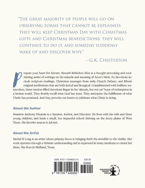 Advent is a season of remembrance and celebration of Jesus coming to earth. But as Christmas comes, we often find it challenging to be mindful of its miracle and meaning. In this daily devotional, Brandon Anthony Shuman offers twenty-six meditations that will prepare your heart for Advent. Comprised of scriptural interludes, contemplations from saints, past and present, and fifteen original compositions seasoned over the course of twelve Decembers, Beneath Bethlehem Skies: 26 Advent Meditations Upon the Miracle and Meaning of Jesus's Birth is a modern liturgy that awakens the soul to wonderful reality of Christmas. Lyrical and liturgical; simple, yet profound; rooted in scripture and rich in thought, these devotions linger, like Advent itself. Each meditation uniquely explores a paradoxical theme of Advent (exile, silence, justice, love, etc.) while exalting biblical truth with beautiful language. They wait in the aching tension of "already, but not yet" hope of redemption in a broken world. They recall what God has done. They anticipate the fulfillment of His promises. And they provoke our hearts to celebrate what Jesus is doing. This hardcover edition, of Beneath Bethlehem Skies is beautifully adorned with breathtaking watercolors by Rachel Long. Ms. Long's vision for this project infuses rich colors and multiple layers of connotation. Her artwork is filled with iconic symbols and scenes from scripture that harken contemporary meaning within Advent's Hebraic roots. Each piece invites the viewer to "lean in" and see what God is doing. These traditional watercolors are both a delight to the eyes and an invitation to commune with the Messiah. For the paperback edition, the devotions of Beneath Bethlehem Skies are introduced by inspiring words from great saints - both ancient and modern - of the Christian faith. Their wisdom foreshadows the themes, lamentations, and joys to follow. Each meditation is complimented by the texts of classic Hymns of the Christmas season, allowing the reader to appreciate the rich and beautiful poetry expressed in their familiar refrains. The eBook incorporates both the watercolors and hymns with the meditations. Beneath Bethlehem Skies is more than a series quick words and pretty pictures wrapped with Bible verses. It is an invitation to be renewed by the miracle of Christmas and receive the gift of Jesus. Rediscover the wonder of Advent this season, Beneath Bethlehem Skies.