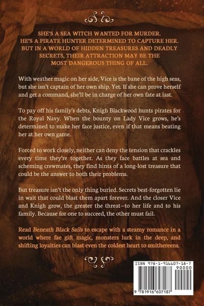 She's a sea witch wanted for murder. He's a pirate hunter determined to capture her. But in a world of hidden treasures and deadly secrets, their attraction may be the most dangerous thing of all. With weather magic on her side, Vice is the bane of the high seas, but she isn't captain of her own ship. Yet. If she can prove herself and get a command, she'll be in charge of her own fate at last. To pay off his family's debts, Knigh Blackwood hunts pirates for the Royal Navy. When the bounty on Lady Vice grows, he's determined to make her face justice, even if that means beating her at her own game. Forced to work closely, neither can deny the tension that crackles every time they're together. As they face battles at sea and scheming crewmates, they find hints of a long-lost treasure that could be the answer to both their problems. But treasure isn't the only thing buried. Secrets best-forgotten lie in wait that could blast them apart forever. And the closer Vice and Knigh grow, the greater the threat-to her life and to his family. Because for one to succeed, the other must fail. Read Beneath Black Sails to escape with a steamy romance in a world where fae gift magic, monsters lurk in the deep, and shifting loyalties can blast even the coldest heart to smithereens.
