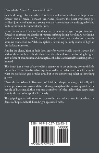 "Beneath the Ashes: A Testament of Faith" In a land ravaged by war, where loss is an unrelenting shadow and hope seems forever out of reach, "Beneath the Ashes" follows the heart-wrenching yet resilient journey of Yasmin, a young woman who endures the unimaginable and finds salvation in her unbreakable faith. From the ruins of Gaza to the desperate corners of refugee camps, Yasmin is forced to confront the depths of human suffering losing her family, her home, and all she once held dear. Yet even as bombs fall and death stalks every breath, Yasmin's connection to Allah strengthens, becoming her only source of light in the darkest moments. Amidst the chaos, Yasmin finds love, only for war to cruelly snatch it away. Left with nothing but her faith, she rises from the ashes of loss, transforming her grief into a force of compassion and strength as she dedicates herself to helping others in need. This is not just a story of survival it's a testament to the enduring power of faith. In the face of unthinkable adversity, Yasmin discovers that true hope lives not in what the world can give or take away, but in the unwavering belief in something greater. "Beneath the Ashes: A Testament of Faith is a deeply moving, spiritually rich tale of perseverance, love, and the enduring strength of the human spirit. For the people of Palestine, faith is not just a comfort-it's the lifeline that keeps them alive in the face of unspeakable tragedy. This gripping novel will transport you to the heart of war-torn Gaza, where the flames of hope and faith burn bright against all odds.