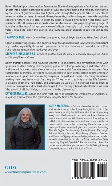 Beneath the Blue Umbrella tells stories of generational trauma and mental illness amid the daily miracles of life and the natural world. After the sudden death of her older half sister, in April 2023, the author finds herself with grief that is complicated by her early childhood memories of the first time she had lost this sister to mental illness. Through narrative poems, interspersed with short memoir pieces, the author tells about her childhood where she not only had to learn to live with the absence of her sister, who played role of second mother, but also with a mother who continued to carry the weight of her Swedish immigrant father's depression and her first husband's loss to schizophrenia . The author then takes the reader with her through the secrets she has uncovered through genealogical research about her sister's biological father, uncle and grandmother and the connections she has made with her sister's living relations who she had not known. The author's sister's father was a psychiatrist who had been diagnosed as schizophrenic after he came home from treating soldiers in World War II. Both he and his younger brother committed suicide, and both experienced trauma as a result of their war experiences. The poems address problems with diagnosis and treatment of mental health problems and how stories, like diagnoses, are not always passed on correctly. The author reveals how these experiences ended up shaping her career as a psychologist and a poet, and how uncovering and telling hidden family stories turned out to be a force for renewed health. While the book speaks to the heart of those who have suffered from the stigma surrounding mental illness and struggled to understand the pain passed down through families, ultimately it is about living beneath an umbrella of love, finding interconnection, resilience and healing through our shared rituals and creative work.