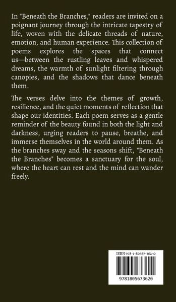 In "Beneath the Branches," readers are invited on a poignant journey through the intricate tapestry of life, woven with the delicate threads of nature, emotion, and human experience. This collection of poems explores the spaces that connect us-between the rustling leaves and whispered dreams, the warmth of sunlight filtering through canopies, and the shadows that dance beneath them. The verses delve into the themes of growth, resilience, and the quiet moments of reflection that shape our identities. Each poem serves as a gentle reminder of the beauty found in both the light and darkness, urging readers to pause, breathe, and immerse themselves in the world around them. As the branches sway and the seasons shift, "Beneath the Branches" becomes a sanctuary for the soul, where the heart can rest and the mind can wander freely.