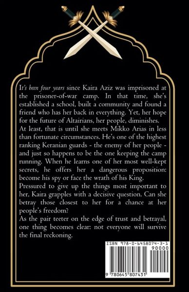 It's been four years since Kaira Aziz was imprisoned at the prisoner-of-war camp. In that time, she's established a school, built a community and found a friend who has her back in everything. Yet, her hope for the future of Altairians, her people, diminishes. At least, that is until she meets Mikko Arias in less than fortunate circumstances. He's one of the highest ranking Keranian guards - the enemy of her people - and just so happens to be the one keeping the camp running. When he learns one of her most well-kept secrets, he offers her a dangerous proposition: become his spy or face the wrath of his King. Pressured to give up the things most important to her, Kaira grapples with a decisive question. Can she betray those closest to her for a chance at her people's freedom? As the pair teeter on the edge of trust and betrayal, one thing becomes clear: not everyone will survive the final reckoning.