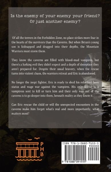 Is the enemy of my enemy my friend or another enemy? Of all the terrors in the Forbidden Zone, no place strikes more fear in the hearts of the survivors than the Caverns. But when Bryan's young son is kidnapped and dragged into its depths, the Mountain Warriors must storm it. They know the caverns are filled with blood mad vampires, but there's a lurking evil they didn't expect and a depth of deception they aren't prepared for. Despite their usual bravery, when the rescue turns into violent chaos, the warriors retreat and Eric is abandoned. No longer the inept fighter, Eric is ready to shed his reluctant hero status and wage war against the vampires. His only friend is a vampiress sent to kill or turn him and their only way out of the caverns is to go deeper into them, beneath reality as they know it. Can Eric rescue the child or will the unexpected encounters in the caverns make him forget what's real and more importantly, what matters most?