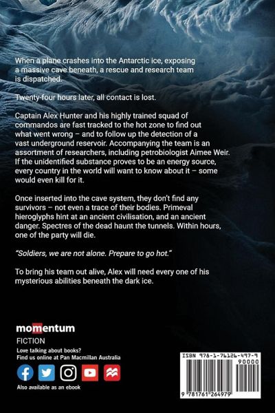 When a plane crashes into the Antarctic ice, exposing a massive cave beneath, a rescue and research team is dispatched. Twenty-four hours later, all contact is lost. Captain Alex Hunter and his highly trained squad of commandos are fast tracked to the hot zone to find out what went wrong - and to follow up the detection of a vast underground reservoir. Accompanying the team is an assortment of researchers, including petrobiologist Aimee Weir. If the unidentified substance proves to be an energy source, every country in the world will want to know about it - some would even kill for it. Once inserted into the cave system, they don't find any survivors - not even a trace of their bodies. Primeval hieroglyphs hint at an ancient civilisation, and an ancient danger. Spectres of the dead haunt the tunnels. Within hours, one of the party will die. "Soldiers, we are not alone. Prepare to go hot." To bring his team out alive, Alex will need every one of his mysterious abilities beneath the dark ice.