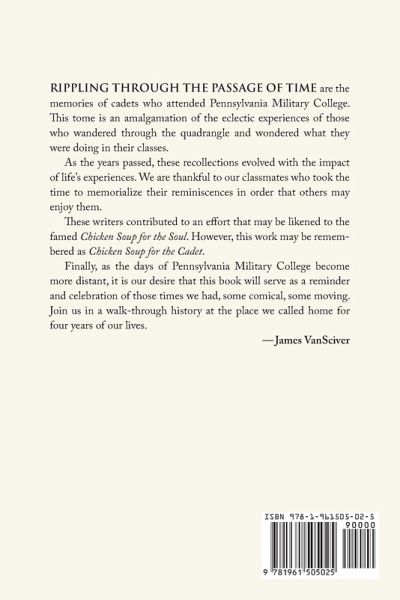 Rippling through the passage of time are the memories of cadets who attended Pennsylvania Military College. This tome is an amalgamation of the eclectic experiences of those who wandered through the quadrangle and wondered what they were doing in their classes. As the years passed, these recollections evolved with the impact of life's experiences. We are thankful to our classmates who took the time to memorialize their reminiscences in order that others may enjoy them. These writers contributed to an effort that may be likened to the famed Chicken Soup for the Soul. However, this work may be remembered as Chicken Soup for the Cadet. Finally, as the days of Pennsylvania Military College become more distant, it is our desire that this book will serve as a reminder and celebration of those times we had, some comical, some moving. Join us in a walk-through history at the place we called home for four years of our lives. - James VanSciver