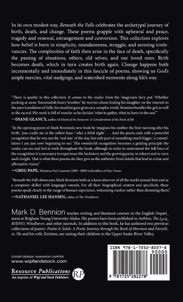 In its own modest way, Beneath the Falls celebrates the archetypal journey of birth, death, and change. These poems grapple with upheaval and peace, tragedy and renewal, estrangement and conversion. This collection explores how belief is born in simplicity, mundaneness, struggle, and seeming irrelevancies. The complexities of faith then arise in the face of death, specifically the passing of situations, others, old selves, and our loved ones. Birth becomes death, which in turn creates birth again. Change happens both incrementally and immediately in this fascicle of poems, showing us God's ample mercies, vital nudgings, and watershed moments along life's way.