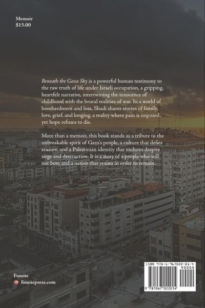 Beneath the Gaza Sky is a powerful human testimony to the raw truth of life under Israeli occupation, a gripping, heartfelt narrative, intertwining the innocence of childhood with the brutal realities of war. In a world of bombardment and loss, Shadi shares stories of family, love, grief, and longing, a reality where pain is imposed, yet hope refuses to die. More than a memoir, this book stands as a tribute to the unbreakable spirit of Gaza's people, a culture that defies erasure, and a Palestinian identity that endures despite siege and destruction. It is a story of a people who will not bow, and a nation that resists in order to remain.