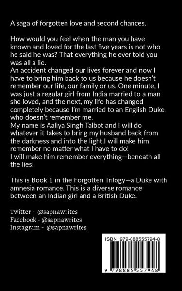 A saga of forgotten love and second chances. How would you feel when the man you have known and loved for the last five years is not who he said he was? That everything he ever told you was all a lie.An accident changed our lives forever and now I have to bring him back to us because he doesn’t remember our life, our family or us. One minute, I was just a regular girl from India married to a man she loved, and the next, my life has changed completely because I’m married to an English Duke, who doesn’t remember me.My name is Aaliya Singh Talbot and I will do whatever it takes to bring my husband back from the darkness and into the light.I will make him remember no matter what I have to do!I will make him remember everything—beneath all the lies! This is Book 1 in the Forgotten Trilogy—a Duke with amnesia romance. This is a diverse romance between an Indian girl and a British Duke.